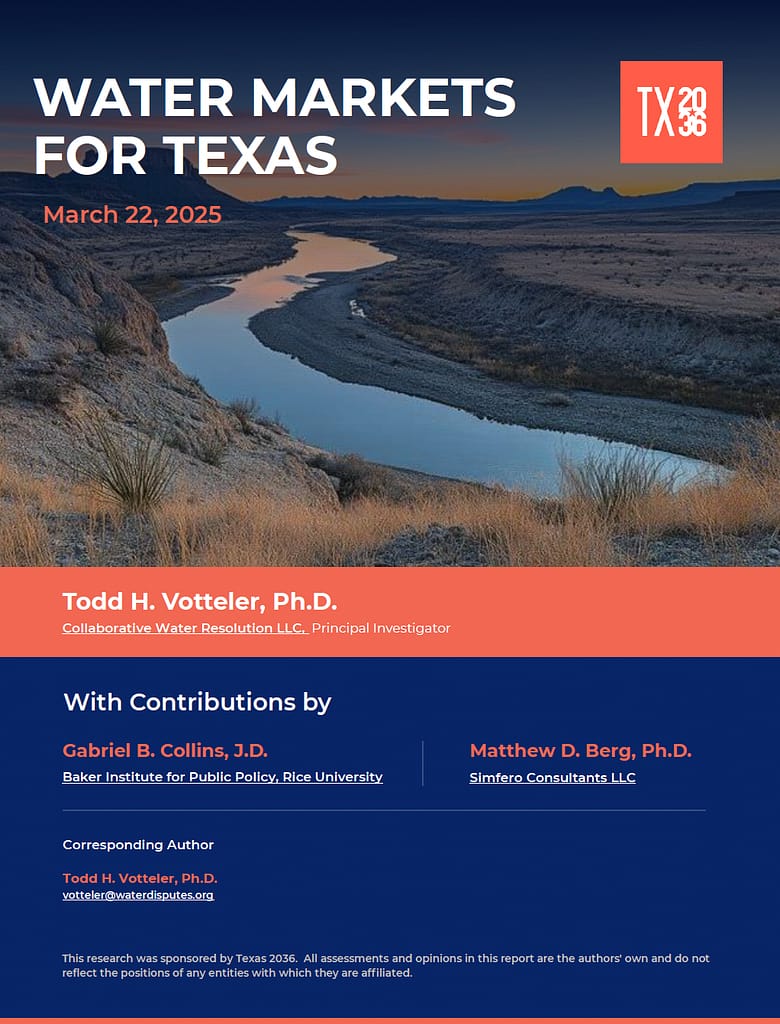 Written by Todd H. Votteler, Ph.D., in collaboration with Texas 2036, this report examines existing water markets in Texas and elsewhere that enable voluntary water transfers that result in more efficient and effective use of existing water resources. (March 2025)