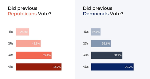 NOTE: The numbers and letters in the chart above refer to the number of previous primaries and the primary contest. For example, 2R means two previous Republican primaries.