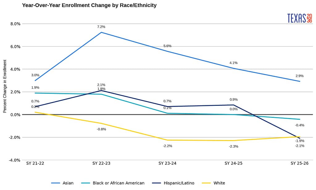 Between SY 24-25 and SY 25-26, overall public school enrollment declined by 76,613 students. In the same time period, the number of Hispanic students shrunk by 61,781, which represents 81% of the total student decline. This disproportionate impact on Hispanic students — Texas’ largest student group — signals a demographic shift that could reshape school district funding and resources for years to come.
