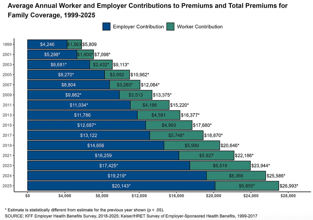 Recent findings from the KFF 2025 Employer Health Benefits Survey show that the increasing price of health insurance is putting a strain on employers and employees. Premiums have climbed steadily, eroding gains from wage growth and threatening the affordability of employer-sponsored coverage.